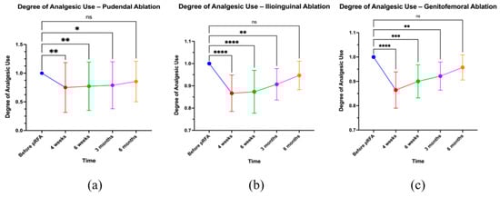 Reported Analgesic Use Over Time Following Ablation by Nerve Type. (a) Pudendal ablation; (b) Ilioinguinal ablation; (c) Genitofemoral ablation. Asterisks indicate levels of statistical significance: * = p < 0.05; ** = p < 0.01; *** = p < 0.001; **** = p < 0.0001. “ns” = not significant.