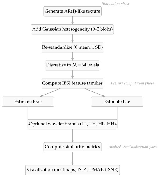 We set out to build a controlled yet expressive sandbox in which fractal dimension (Frac) and lacunarity (Lac) can be compared fairly against a broad panel of standardized radiomic features, including a multiscale wavelet branch. Each synthetic sample is a region of interest (ROI) that exhibits tunable spatial correlation and optional focal heterogeneity; all samples are then discretized to gray levels. Features are computed directly from the mathematical definitions given earlier, and similarity between Frac/Lac and each descriptor is quantified with multiple, complementary dependence measures defined in Section 3.4. The workflow mirrors common radiomics practice—textures ranging from fine to coarse, with or without a lesion-like structure—while preserving enough control to make causal attribution transparent (see Table 1 and Table 2 for concise summaries). For clarity, Figure 1 provides an overview of the simulation workflow.