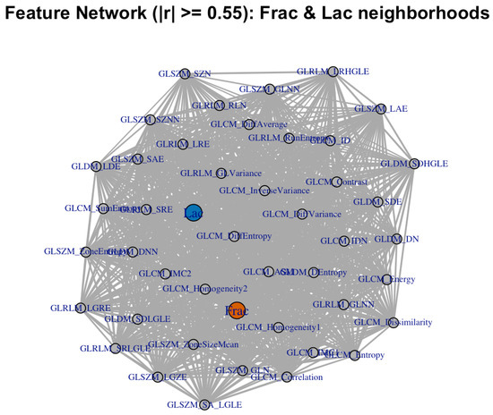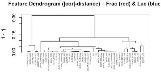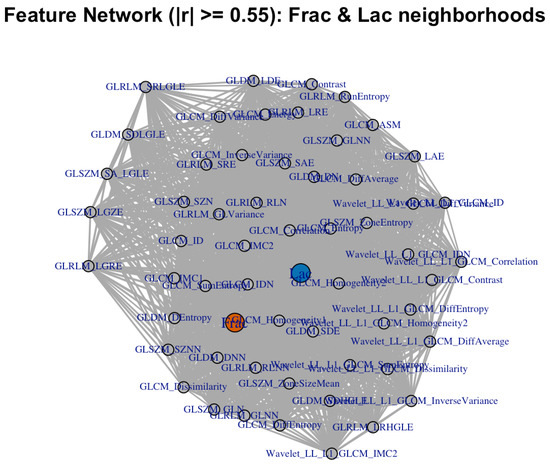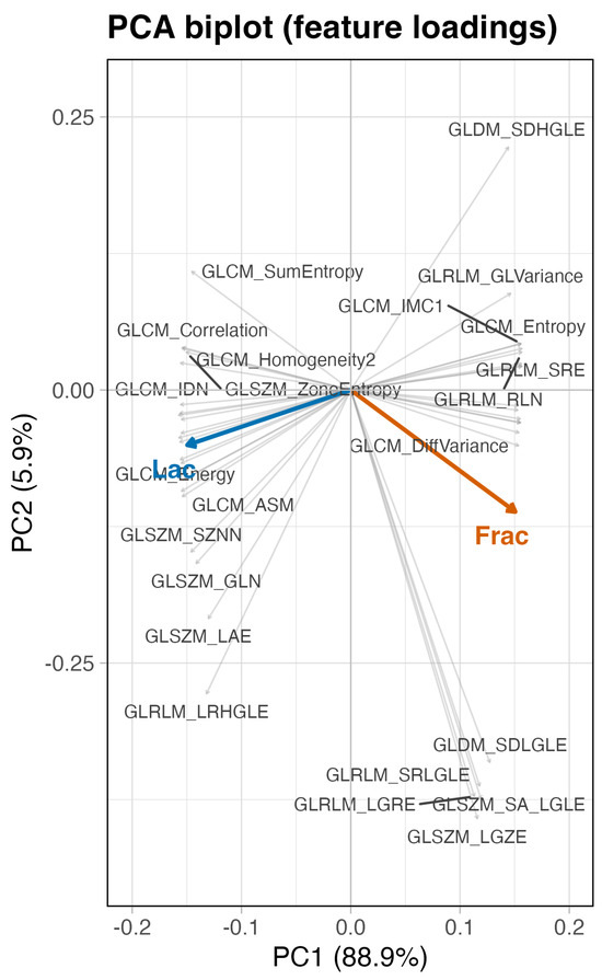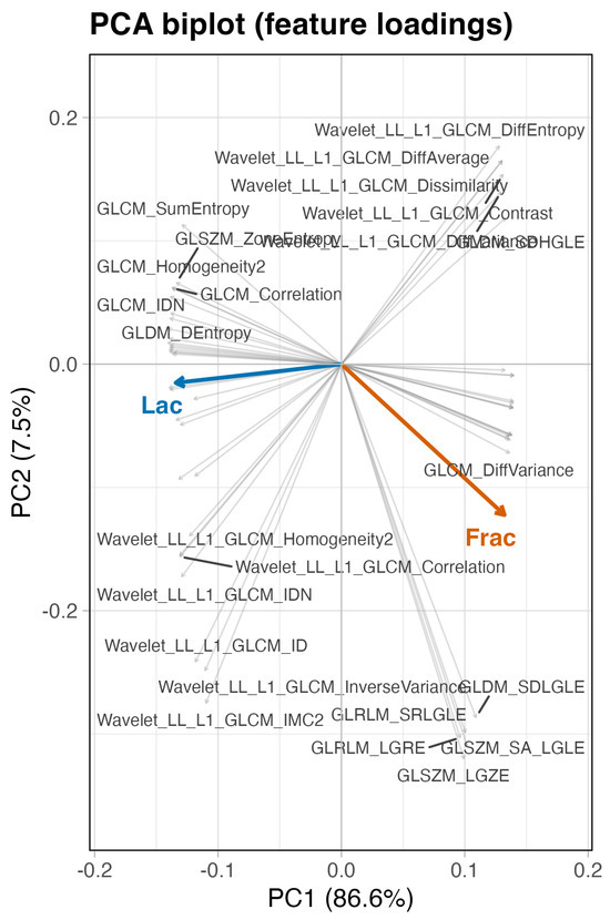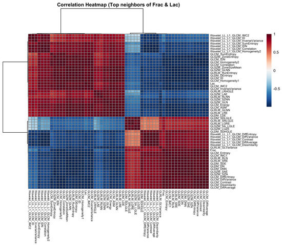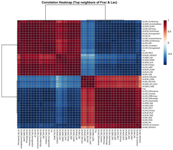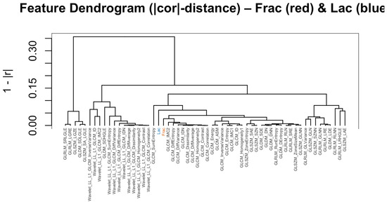 Empirically, a stable two-block organization emerges that aligns with the intended behavior of established feature families. Frac is closely associated with contrast, difference, and short-run statistics that describe high-frequency texture variation, while Lac aligns with large-structure, homogeneity, and long-run statistics. The addition of wavelet features sharpens this distinction, as detail-band components correspond more strongly with Frac, and approximation-band components correspond with Lac. Collectively, these findings indicate that fractal measures are overlapping yet non-duplicative; they follow known axes of variation already represented in IBSI features but retain interpretable multiscale summaries that can be particularly useful when heterogeneity across scales is an essential characteristic.