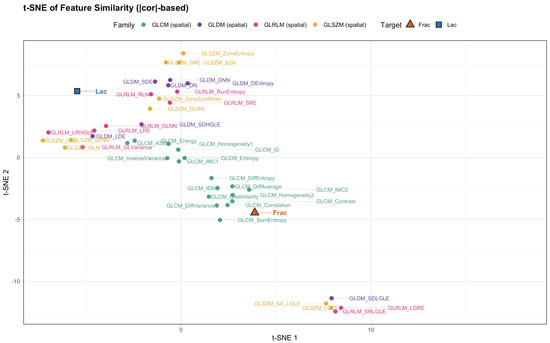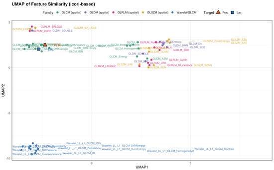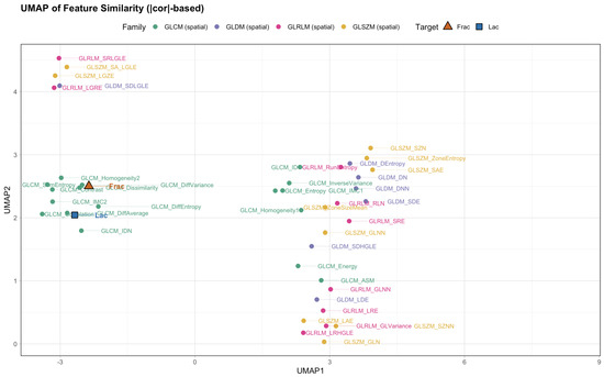 Because these five measures operate on different scales and emphasize different aspects of dependence, we combine them into a single consensus score. For a fixed target (either Frac or Lac), we compute against every other feature, z-score each metric across those comparisons, and average the five z-scores to obtain the composite similarity used for ranking. For r and , we report two-sided p-values with Benjamini–Hochberg false discovery rate (FDR) correction over all comparisons for that target [36]. When a distance is required for clustering or embeddings, we use