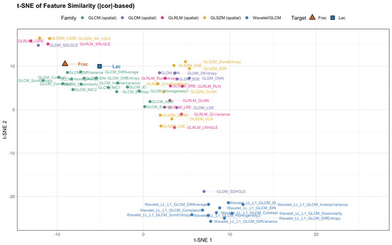 This section explains how we quantify the relatedness between Frac and Lac and the remaining radiomic features, and how we create the two-dimensional maps that summarize their neighborhood structure. We begin by defining the pairwise similarity measures used to rank nearest neighbors, then describe the consensus score that combines them, and finally outline the low-dimensional embeddings used for visualization.