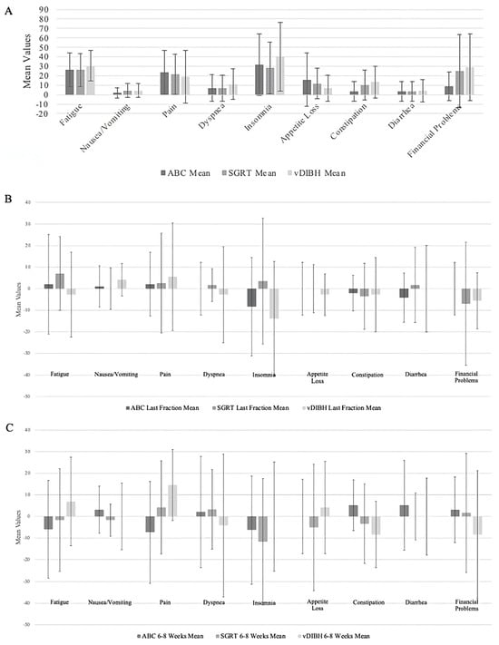 (A) Bar graph of baseline mean values for the symptom scales of the EORTC QLQ-C30 between the three breath-hold groups. Error bars represent the standard deviation for each mean. Lower scores indicate better quality of life. (B,C) Bar graph of mean change in quality of life for the symptom scales of the EORTC QLQ-C30 between the three breath-hold groups at last fraction (B) and 6–8 weeks follow-up (C). Error bars represent the standard deviation for each mean. Negative values indicate improved quality of life. Abbreviations: ABC = active breathing control, SGRT = surface-guided radiation therapy, vDIBH = voluntary deep inspiration breath-hold.