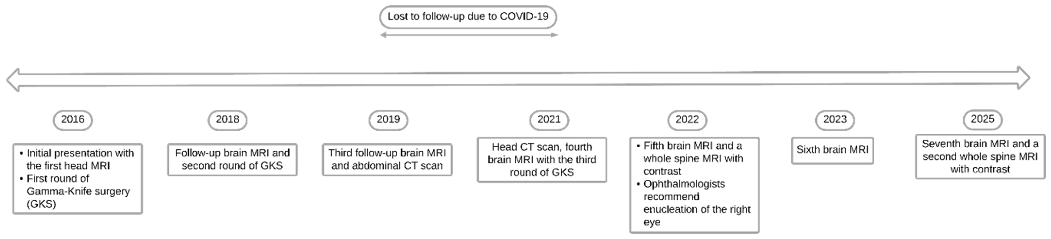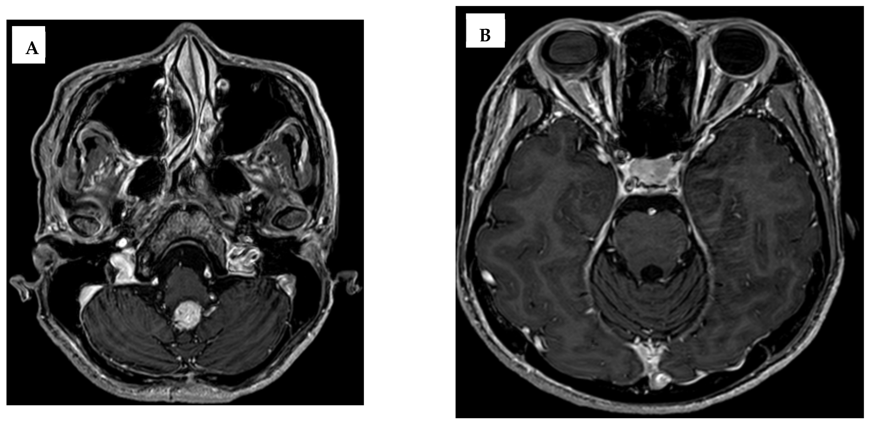 - Huntoon, K.; Shepard, M.J.; Lukas, R.V.; McCutcheon, I.E.; Daniels, A.B.; Asthagiri, A.R. Hemangioblastoma diagnosis and surveillance in von Hippel-Lindau disease: A consensus statement. J. Neurosurg. 2022, 136, 1511–1516. [Google Scholar] [CrossRef] [PubMed]
