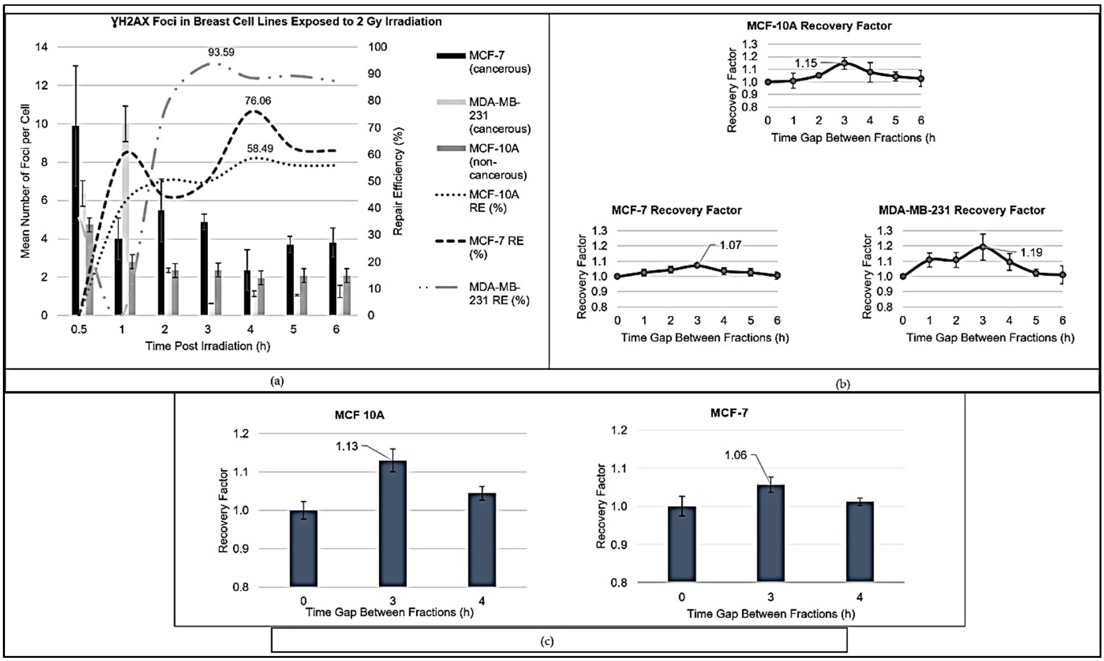 The relative sensitivity (RS) of MCF-7 and MDA-MB-231 cells was below 1, underscoring their decreased sensitivity to radiation. This lower radiosensitivity could be attributed to differences in the shoulder region of the survival curves, where lower α/β ratios yield a more gradual decrease in survival following irradiation. Such subtleties in cell-line responses have vital implications for structuring tailored treatment regimens aimed at maximising tumour control while protecting normal tissues. A comprehensive assessment of repair dynamics following irradiation revealed distinct patterns across the breast cell lines. MCF-10A exhibited steady increases in repair efficiency, while MCF-7 demonstrated a biphasic response, and MDA-MB-231 displayed a rapid escalation in repair effectiveness, as observed in