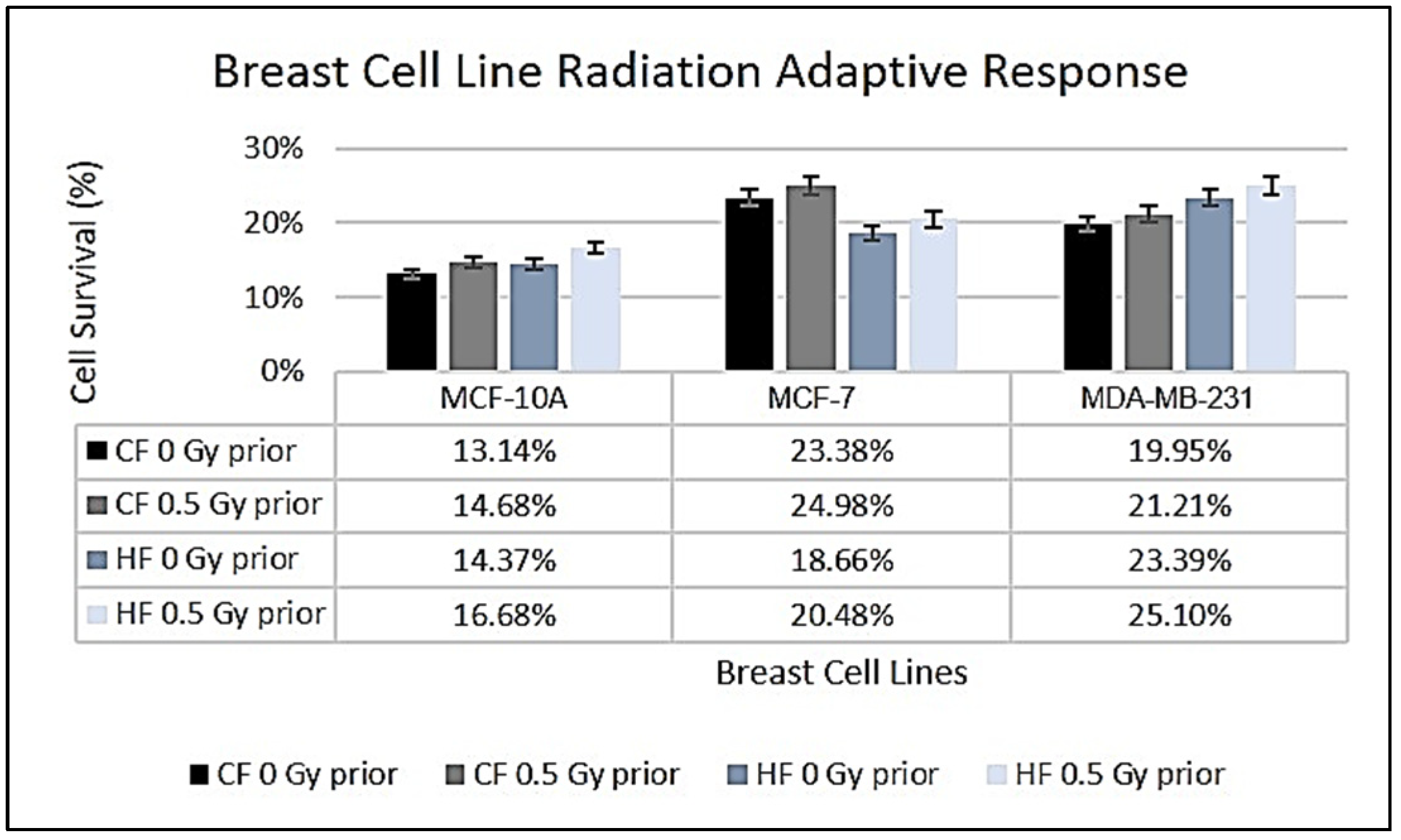 42]. In contrast, the cancerous MCF-7 and MDA-MB-231 cell lines displayed considerable differences in survival rates between CF and HF regimens. MCF-7 exhibited a survival fraction of 23.38% under CF, which decreased to 18.66% under HF. The receptor status of MCF-7 (oestrogen receptor-positive and progesterone receptor-positive) likely influences this response to radiation, whereby hormonal signalling may modulate survival and stress responses initiated by increased radiation doses [