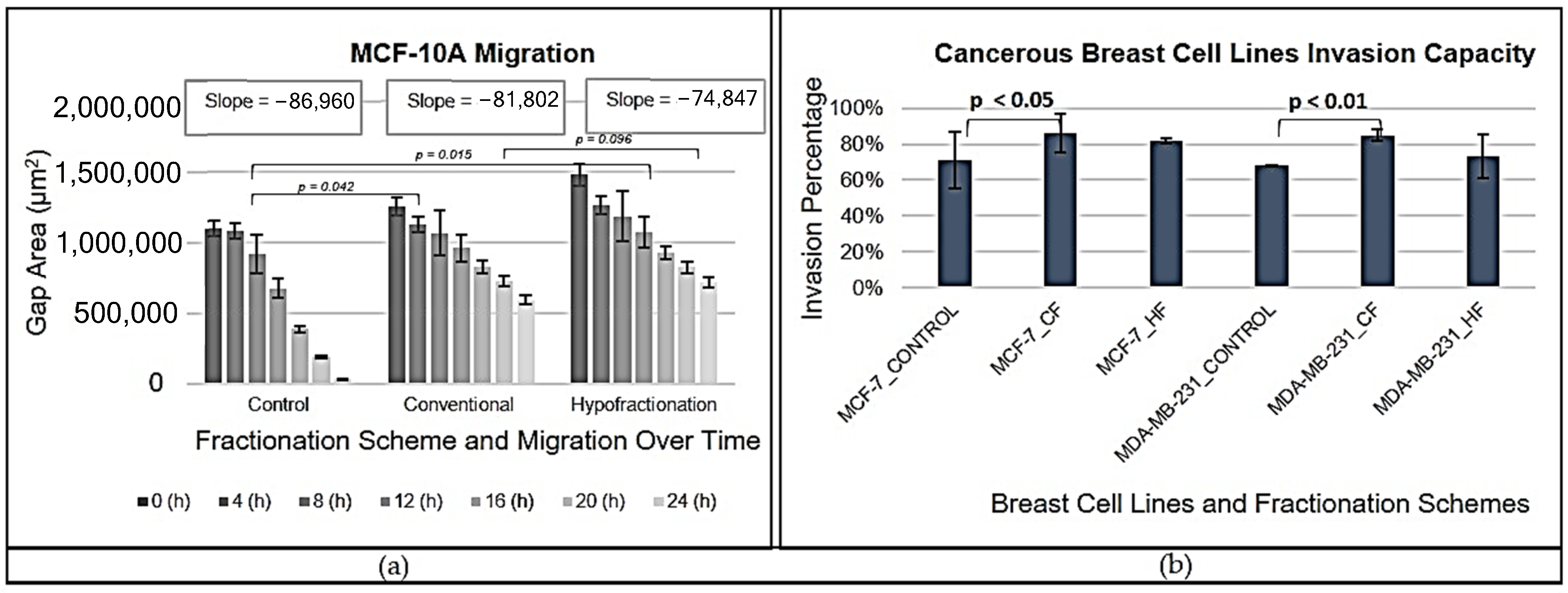 The migration capabilities of MCF-10A cells illuminated how radiation therapy affects cell motility. Unirradiated cells exhibited the steepest slope in gap closure curves, indicating the highest migration speed, which is consistent with previous studies suggesting untreated cells maintain unrestricted migratory capabilities [