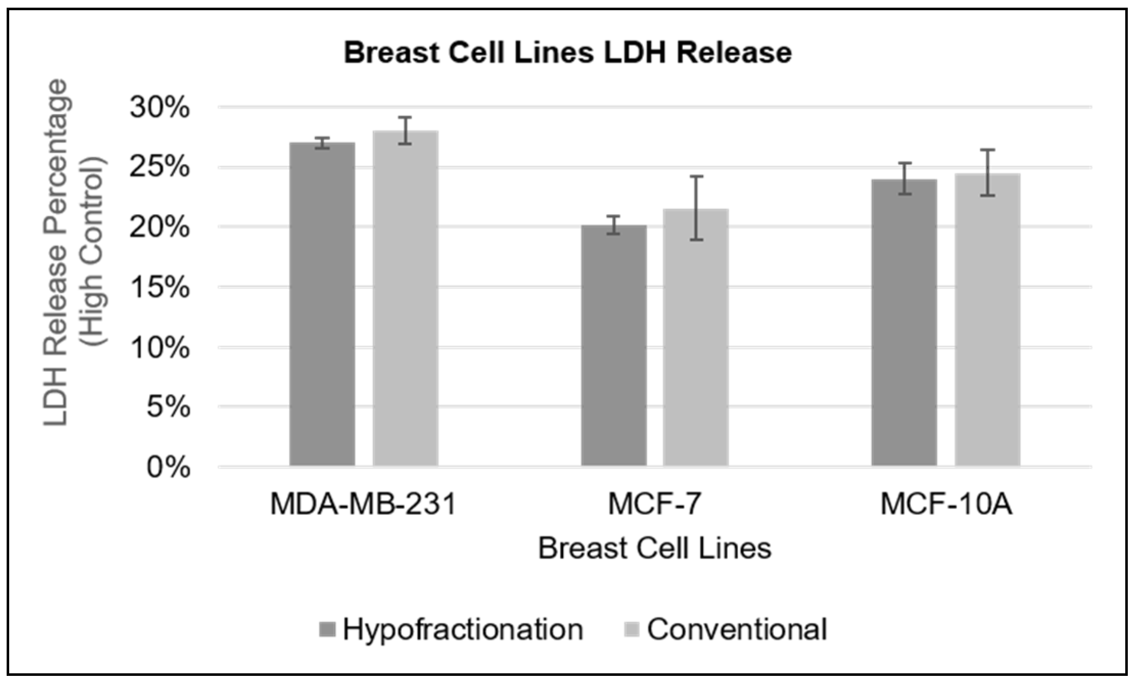 5 cells/mL. A total of 500,000 cells were irradiated in suspension prior to seeding into a flat-bottom 96-well plate. These cells were then subjected to either conventional fractionation (2.00 Gy × 4 fractions for a total of 8.00 Gy with a 3-h inter-fractional interval) or hypofractionation (single doses of 4.88 Gy for MCF-10A, 5.45 Gy for MDA-MB-231, and 5.23 Gy for MCF-7). Following irradiation, the cells were allowed to recover in the incubator for 24 h. After the recovery period, lysis buffer (600 μL) was added to the designated high-control wells to induce lysis, while low control wells remained untreated. The plate was then incubated at 37 °C for 30 min. Subsequently, the LDH levels in the cell culture supernatant were measured. The assay mixture was prepared as per the instructions of the assay kit, and 100 µL of the reaction solution was added to each well containing the supernatant. The plate was incubated at room temperature for an additional 30 min to allow the reaction to develop. Finally, absorbance was recorded at 490 nm using a microplate reader (Berthold Technologies Bad Wildbad, Germany, Version 2.2.2.1).