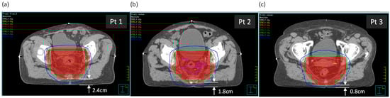 The three patients, (a) Patient 1, (b) Patient 2, and (c) Patient 3, shown at the axial isocentric plane. Distances from the posterior surface to the PTV are shown.