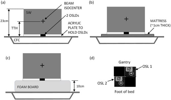 Solid water phantom setup. (a) SW and OSLDs set up directly on the CFC; (b) phantom set up on the mattress; (c) phantom setup on the foam board. The beam isocenter is centered laterally and in the cranio-caudal direction. Panel (d) shows the OSLD layout (top view) as set inside the acrylic plate, with two measurement OSLDs and two “filler” OSLDs to avoid air gaps.