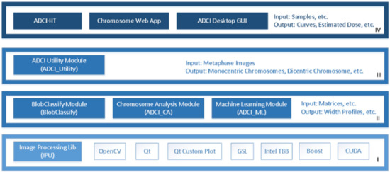 ADCI Project: Inventory of modules by software layer. Illustration of the HT implementation of the ADCI software. I. Supporting libraries: public, open source (unfilled boxes) and proprietary (filled boxes) components called by functional modules. II. Functional modules used by the ADCI Interface. III. Interface called by applications. IV. Different software Applications using ADCI interface to process images.