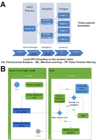 The Automated Dicentric Chromosome Identifier and Dose Estimator (ADCI) is a medical image processing system that leverages machine learning to analyze metaphase cell samples from different individuals, in the form of images, to identify dicentric chromosomes as an indicator of the patient’s level of radiation exposure that would then be used to determine the treatment needed, if any [23,24,25]. The current Windows-based implementation of the system substantially reduces the time required for laboratories to estimate radiation exposures without compromising accuracy. However, in a large-scale radiation accident or mass casualty, data from many different individuals would need to be processed quickly. A bank of personal computers running ADCI may not be able to meet the throughput required to triage entire populations on the scale of a moderate sized city.