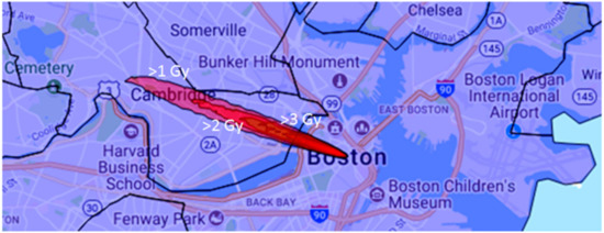We estimated the size of the population exposed to different levels of radiation by intersecting geographic contours of minimum radiation exposure levels computed by HPAC v4.02 software (Hazard Prediction and Assessment Capability; developed by the Defense Threat Reduction Agency [DTRA]) with the census in these regions. Keyhole Markup Language (KMP)-based boundary location files for counties and subdivisions from the US census bureau website were downloaded in XML format. Census boundaries that overlap radiation contour plumes were obtained by transforming the polygons of each boundary to Google Maps-encoded polygons and creating javascript (‘plume-census.js’) that draws all the polygons in a map in HTML. The US Census API (api.census.gov/data/2016/pep/population; Application Program Interface; accessed on 23 February 2018) was interrogated with the intersecting subdivisions to estimate populations residing in the plume and the sum of all populations within a contour estimates the affected population exceeding a particular exposure level (e.g., >3, >2, >1 Gy). Applying this strategy to several large US cities, which are designated as “incorporated places”, had limited success as the populations of these regions are not directly accessible through the API.