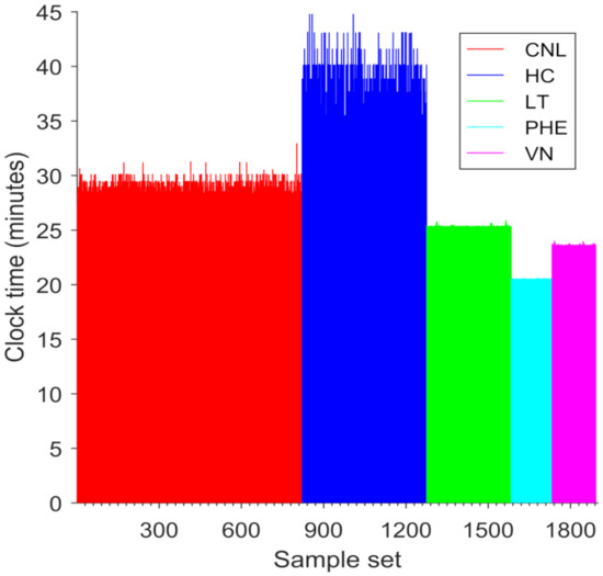 Large scale simulation based on multi-center biodosimetry exercise sample sets. Test image samples acquired from 5 separate laboratories consisting of 46,196,000 metaphase images were processed by ADCI-HT in just over 25 h. Duration of each sample set are as follows: CNL: 14:06:22; HC: 06:27:22; LT: 03:16:21; PHE: 01:28:40; VN: 01:44:02. Times correlated to the total number of images in each data set.