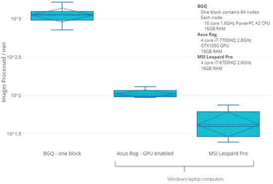 Comparison of ADCI throughput for different hardware platforms. The rate in which images are processed using only a single BG/Q processor block is ~10× fold faster than a GPU-enabled i7 laptop (4-core i7-7700HQ 2.8 GHz processor, GTX1050 GPU and 16 GB RAM). Image processing throughput can be increased further using multiple processor blocks via BG/Q scheduler.