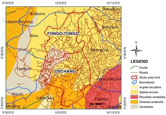 This area is underlain by an extensive and thick loose mantle developed on trachyte and generally forms a differentiated geological profile, including the presence of deposits formed by new bauxite minerals; it was discovered in 1957 by BUMIFOM prospectors [,]. This locality is one of the main bauxite deposit sites in the western region of Cameroon. Its potential is estimated at 45 million tons and is a part of the major geological reserves of Cameroon [,]. Figure 1 shows a geological map of the study area.