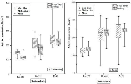 In Dschang, the 226Ra, 232Th, and 40K activity concentrations range from 99 to 167 Bq kg−1 and from 98 to 181 Bq kg−1 for 226Ra, from 100 to 275 Bq kg−1 and from 139 to 309 Bq kg−1 for 232Th; and from 198 to 297 Bq kg−1 and from 151 to 280 Bq kg−1 for 40K. Figure 2 shows the box-plot distributions of these concentrations in laboratory (a) and in situ (b) for each locality and for the whole study area.
