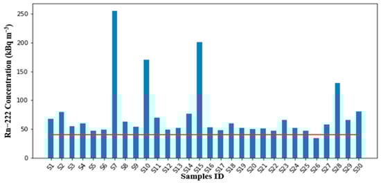 222Rn concentrations at 1 m depth in soil, presented in Table 2, ranged from 35 to 202 kBq m−3, with a mean value of 69 ± 40 kBq m−3, in Fongo-Tongo; and from 48 to 255 kBq m−3, with a mean value of 82 ± 56 kBq m−3, in Dschang. According to Table 2, more than half of the sampled points have 222Rn in soil greater than or equal to 62 kBq m−3 in Dschang and 53 kBq m−3 in Fongo-Tongo. According to Figure 3, a majority of the radon concentrations in soil are above the value of 40 kBq m−3, as represented by the red line. According to the Swedish risk assessment criteria, this latter value represents the limit for which a site presents a high radon-exposure risk []. The difference between 222Rn concentrations in soil from one location to another may be due to the geological structure and the mineralogical composition of the soil in the area [,]. The geological structure, the geochemical process of the soil, and the rate of gas emanation in the region are influenced by the permeability of the soil [,,,,].