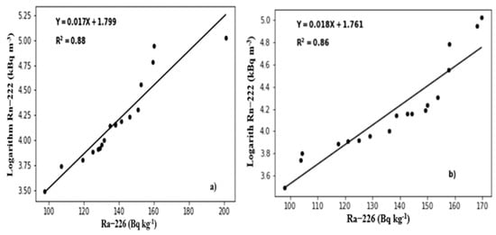 Correlation between 222Rn/226Ra concentrations in soil: (a) laboratory gamma-ray spectrometry and (b) in situ gamma-ray spectrometry.