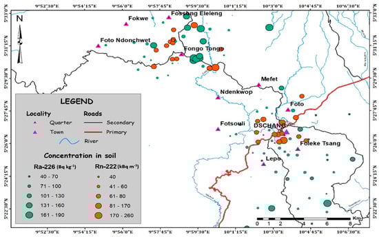 Many investigations on natural radioactivity have been made in the world [,,]. The investigation conducted in Cameroon revealed the occurrence of high levels of radioactivity in some specific areas of the country [,,]. These high radioactivity levels are more localized in areas with uranium, thorium, and bauxite mining potential. It is the case of the natural radioactivity measurements made in Poli and Lolodorf, Douala, Fongo-Tongo, Dschang, and Ngaoundal [,,]. They revealed high 238U, 232Th, and 40K activity concentrations in soil compared to their corresponding world levels, as well as 222Rn and 220Rn concentrations in dwellings above the WHO reference level [,,,]. These mentioned studies showed that the 222Rn level in homes depends considerably on the type of architecture, geological structure, and mineralogical composition of soil of the area [,]. A good correlation between 238U and 232Th activity concentrations in soil with 222Rn and 220Rn in dwellings was found in the areas, respectively [,].