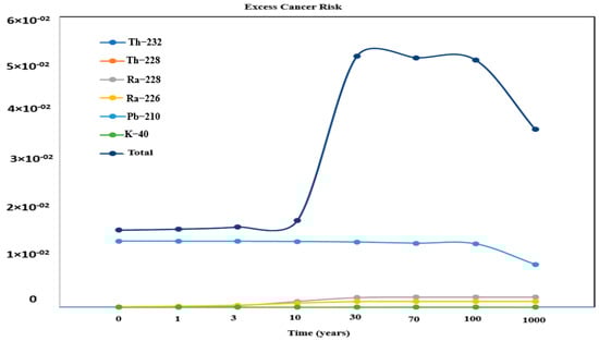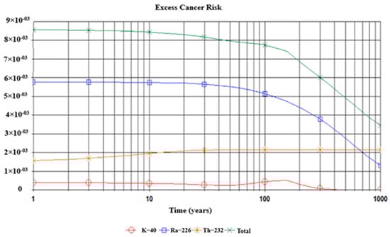 The results presented in Table 6 show that 226Ra is the main contributor to the total excess risk compared to 232Th and 40K. The risk due to 226Ra increases progressively with time until reaching an increasing threshold after 70 years. The occurrence of this radionuclide in high concentrations in building materials increases the probability of accumulation of high indoor radon concentration []. Figure 7 represents the long-term total ECR for each radionuclide.