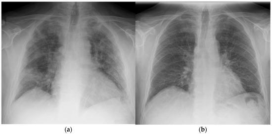 Chest X-ray taken of patient 1 at (a) day 1 prior to radiotherapy and (b) day 42 post treatment.