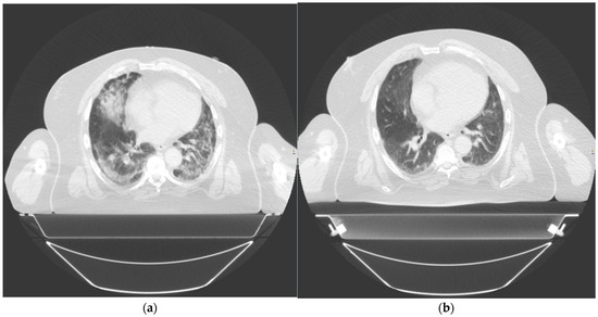 Thorax computed tomography (CT) taken of patient 2 at (a) day 1 prior to treatment and (b) day 42 post treatment.