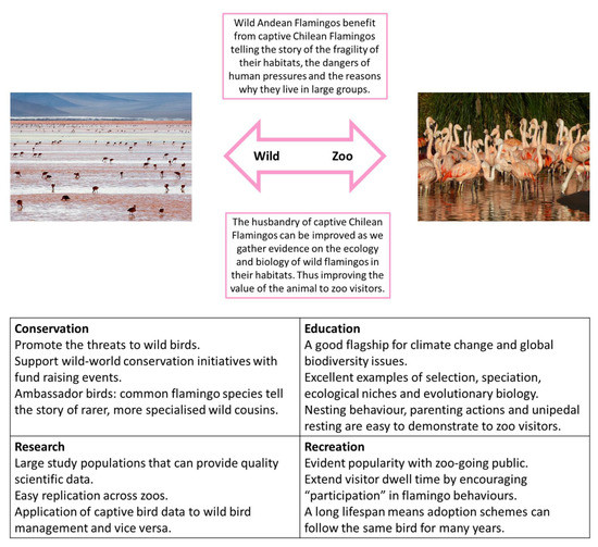 The example provided above shows how the development of a bird exhibit, using information provided by field conservation biologists plus husbandry practice based on ecological information, allows the display of zoo-housed birds to be conducted in an increasing naturalistic settings, which integrate conservation relevance into all areas of the visitor experience, both whilst at the zoo and after they have left. In areas of the world where zoo regions have specified aims as outlined in legislation or policy [52], holding specific species within the animal collection can successfully promote these aims to the organization’s visitors and members. This approach is illustrated and explained by Figure 2 using a common and (relatively) easy to breed flamingo, the Chilean Flamingo (Phoenicopterus chilensis), as the ambassador species for the more threatened Andean Flamingo (Phoenicoparrus andinus).