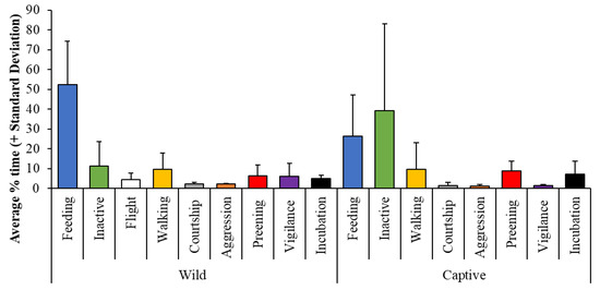 A key area of evidence needed for successful development and implementation of One Plan Approaches to show how to evaluate the relevance of zoo enclosures to bird activity patterns is that from wild behavioral ecology. Comparing the activity patterns of wild animals to best understand the behavior of individuals under human care, their behavioral normality and welfare experience are not new [42,56,57,58,59]. Critical evaluation of the relevance (from an ecological standpoint) of captive provision, e.g., husbandry, management protocols and environmental provision, against wild time-activity budgets should be thoughtfully considered to ensure that they are valid when all limitations and variation (i.e., with individual animals, locations, quality of data and environmental heterogeneity) associated with where these wild data came from are considered. Figure 3 shows the usefulness of comparison of captive flamingo behavior with that published on wild flamingo behavior patterns [56]; sampling the published literature and creating standardized comparatives for data mined in this way (i.e., converting raw data to percentages), allowing for a review of what that bird is likely to be doing in captivity, and just how “natural” this may be. Further consideration of un-needed behavior in captivity (e.g., anti-predatory responses) or behavior being promoted by a secure and safer environment (e.g., play) should be included in such reflection of captive activity patterns.