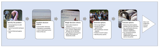 An example of a rational decision making process to increase evidence gathering for best practice husbandry for Lesser Flamingos. Identification of a challenge or problem (in the case of this species, poor ex situ breeding results) leads to the establishment of decision criteria that can guide future action (for example, this species has a declining wild population and is increasingly under pressure from anthropogenic threats, therefore a viable zoo-housed population is a relevant conservation outcome). Ranking of these decision criteria identifies the best course of action for the species.