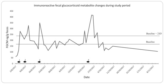 The baseline FGCM level was 164.76 ng/g feces. The upper limit (baseline + 2SD) of the baseline FGCM level was 233.62 ng/g feces. There were increases in the FGCM levels above the upper range of the baseline during the stressful events listed in Section 2.3.