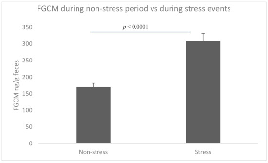 The FGCM levels were significantly higher on the days classified as likely high stress (i.e., 3 days after each stressful event; 308.31 ± 62.58 ng/g of feces, n = 7) compared to days where no stressors were expected (170.15 ± 65.06 ng/g of feces, n = 33; t = −5.13, p < 0.0001, Figure 2).