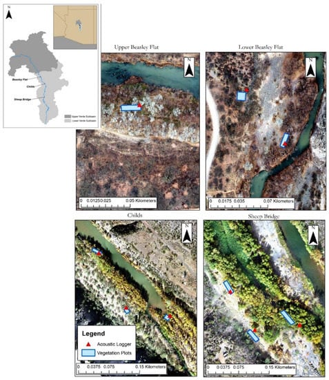 We deployed three Songmeter SM4 (Wildlife Acoustics, Inc., Maynard, MA, USA, passive acoustic recorders at each study reach for a total of nine loggers. Recorders were affixed approximately 3–4 m high in riparian trees and operated daily from 6 May to 2 September 2018 at Beasley Flat and Childs and from 20 May to 2 September 2018 at Sheep Bridge. We programmed acoustic monitors to record for 2 h daily around sunrise, from 0430 to 0630. These times were chosen to coincide with the peak vocalization period of many migrating and breeding birds that use riparian habitat along the river [32]. Similar survey timing has been widely used in bird studies employing count surveys [41]. The location of recorders (Figure 1) was established to represent a gradient of bird habitat quality and vegetation complexity described by Cubley et al. [40]. Placement of recorders were constrained to the width of the riparian forest and within the area of vegetation measurement plots, described below (Figure 1).