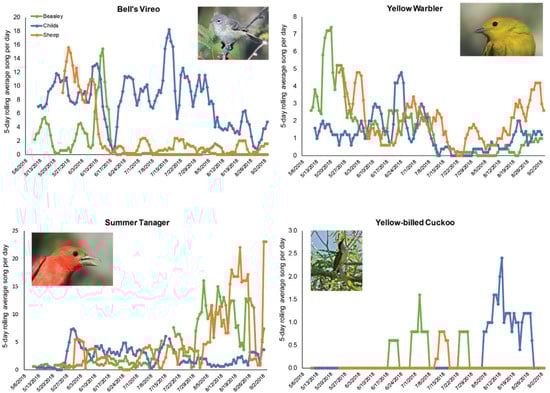 In the Southwest, Yellow Warblers have historically and currently been restricted to areas with mature cottonwood near streams or water [59,60] and are generally not found farther out toward the margins of floodplains in more drought-tolerant forests, such as mesquite woodlands [61,62]. In this study, we detected the species across all three reaches. Of the four species analyzed, Yellow Warbler have the greatest degree of frequency overlap with other common songbirds (e.g., Wilson’s Warbler, Cardellina pusilla) in this system. It is possible that this vocalization led to lower rates of automatic detection by the Yellow Warbler vocalization classifier. Summer Tanagers are Neotropical migratory birds that breed in areas with dense overstory cover of riparian trees near streams [63]. We found that Summer Tanager activity was high near the end of summer at Beasley Flat and Sheep Bridge reaches. Activity was low at Childs, which had the lowest willow cover compared to the other two reaches. Bell’s Vireo are associated with floodplain habitat. However, unlike the other three bird species closely associated with cottonwood and willow, vireos are associated with dense shrubs, hackberry and sycamore trees, and also areas with high canopy cover [63,64,65].