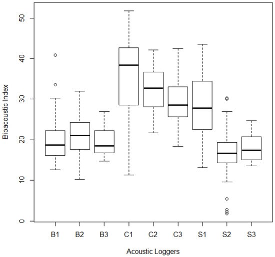 Boxplots (showing quartiles, circles are outliers) of the Bioacoustic Index generated from passive acoustic recorders deployed at three study reaches (B1–B3, Beasley Flat; C1–C3, Childs; and S1–S3, Sheep Bridge) along the Lower Verde River, Arizona (USA). Index was calculated using 5 min daily recordings per logger from 20 May to 8 July 2018.