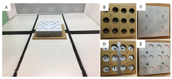 Poke box set up for testing the macaws’ spatial learning performance. (A) The set up in the test room; (B) base wooden layer with 12 wells filled with inaccessible food (seeds for habituation and nut pieces for training); (C) the divider with holes used to separate the top and the bottom layers with holes to release scent; (D) the upper wooden layer containing the accessible rewards (seeds or nuts); and (E) the top plexiglass layer with paper covering the wells.