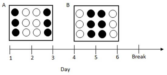 The parrots were first habituated to the box and trained to obtain food (seeds) from the wells by tearing paper (Note S2). The main training started once a parrot tore the paper, using its beak, of 10 (out of 12) or more wells for two or more consecutive days. As the parrots appeared to struggle to tear dry paper, we applied a ring of water over each well in a standardised manner to facilitate tearing (but ensured that tearing the paper still required effort), after the box was set up (Figure 1E). In the training phase, two spatial patterns of rewarded wells (A and B; Figure 3) were created. Pattern A consisted of the two columns at the outer edges of the box (6 wells), whereas pattern B consisted of the two middle columns of the box (6 wells). The parrots experienced three trials of each pattern for three consecutive days (see below for further information). The pattern was then switched for the next 3 days of the week, with no testing on the last day of the week. We counterbalanced the pattern that individuals experienced first, within each species. The order of presenting the patterns was fixed for each individual across the training weeks.