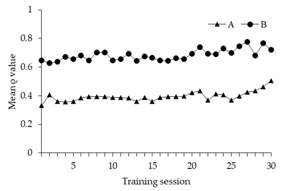 Learning performance, indicated as mean ρ values of both species (N = 12), across training sessions for each pattern.