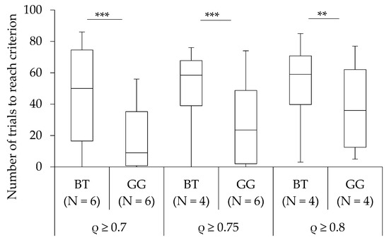 Box plot of three passing criteria, ρ ≥ 0.7 (or 70%), ρ ≥ 0.75 (or 75%), and ρ ≥ 0.8 (or 80%), to assess learning performance for pattern B for each species (BT = Blue-throated Macaws, GG = Great Green Macaws). *** p < 0.001, ** p < 0.01.