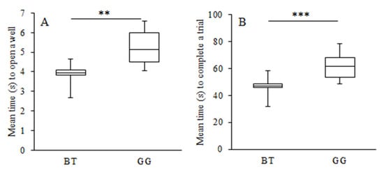 Box plot of mean time (s) to (A) open a well and (B) complete a trial (BT = Blue-throated Macaws, GG = Great Green Macaws). ** p < 0.01, *** p = 0.001.