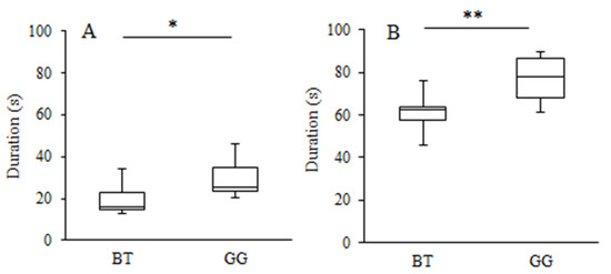 Box plots of exploration-related behaviours: (A) the two species’ ‘exploration after a change of pattern occurs, measured as the mean duration in seconds from opening the last well to leaving the box when the parrots first experience a change in the first week. (B) The mean time in seconds spent on the table across trials (BT = Blue-throated Macaws, GG = Great Green Macaws). * p < 0.05, ** p < 0.01.