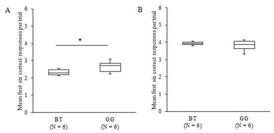 Across all trials (of both patterns), the BT took significantly less time to open a well than the GG (χ21 = 9.77, p = 0.002) (Figure 7A, Note S4, Table S3A) and to complete each trial (χ21 = 10.60, p = 0.001, Median BT = 46.7 s, GG = 61.3 s, Figure 7B, Table S3B). When they first experienced a change (of pattern) in the first week, the mean exploration time after a change of pattern was significantly less in the BT than in the GG (χ21 = 4.35, p = 0.037, Table S3C) (Figure 8A). On average, the mean time spent on the table was also significantly less in the BT than in the GG (χ21 = 7.72, p = 0.005, Table S3D) (Figure 8B). Compared with the BT, the GG made significantly more mean correct responses in the first six responses per trial in pattern A (χ21 = 5.17, p = 0.023, Table S3E) but not in pattern B (χ21 = 0.95, p = 0.329, Table S3F) (Figure 9).
