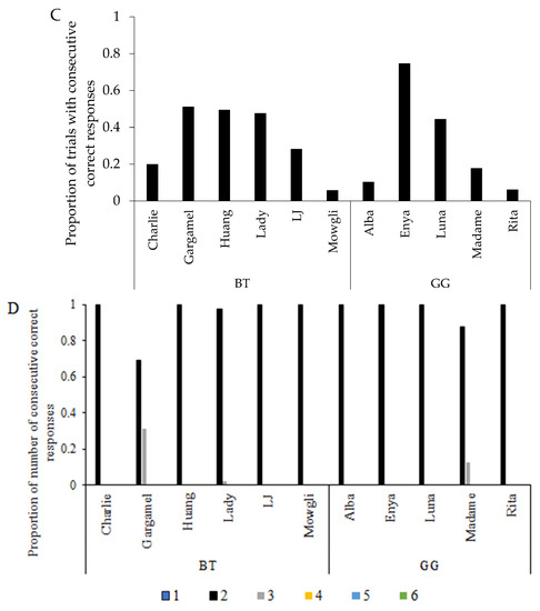 Perhaps the unsuccessful macaws were using an alternative strategy, i.e., opening a well to indicate which pattern they should follow, or that they may have perceived pattern A as two separated columns (Figure 4). In both cases, the search order analysis in the first six responses of each trial should show that the parrots made three or more consecutive responses. We conducted an additional analysis of the first six responses (Note S5), which showed that the macaws did make consecutive correct responses (median proportion of trials with consecutive correct responses BT: 38.0%, GG: 17.8%, Figure 10C), however, they predominantly made 2 (instead of 3 or more) consecutive correct responses (Figure 10D).