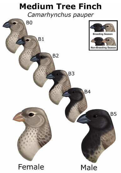 Plumage and beak characteristics in male and female Medium Tree Finch (Camarhynchus pauper). Beak colour in both sexes is light during the non-breeding season and black during the breeding season. Female plumage is grey-brown across their lifetime; the chin can be streaked. Yearling males are grey-brown with a streaky breast; yearling males can be distinguished by females on the basis of behaviour (e.g., song). Male crown and chin black plumage increase with annual moult from no black in yearling males (B0) to males having a fully black crown and chin from around >5 years old (B5 males). Drawing by Lauren K. Common.