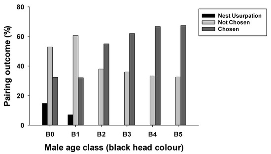 Pairing outcome is shown as the percentage of males whose nest was usurped by another male, not chosen by a female, or chosen by a female in the critically endangered Medium Tree Finch (Camarhynchus pauper). The percentage data are calculated within each male age class (B0 to B5; details in Figure 1). Yearling males are B0 (no black plumage) and males five years and older are B5 (fully black crown and chin). Of 222 nests at which males built a display nest and sang to attract a female, 92 males were not chosen and 7 had their nest usurped by an older conspecific. Pairing success (% males chosen by a female for nesting) was higher in older males.