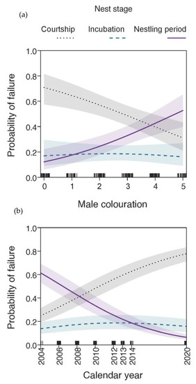 Probability of nest failure in relation to (a) male age (estimated by colouration as displayed in Figure 1) and (b) calendar year at different nest stages of Medium Tree Finch (Camarhynchus pauper) breeding attempts on Floreana Island, Galápagos Archipelago, between 2004 and 2020. Results show predicted line of multinomial logistic regression with 95% CIs; tick marks on x-axis reflect sample size; model details in Table 1.