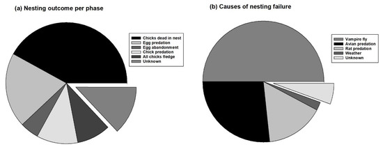 Nesting outcome per phase (eggs, chicks) was calculated for 107 nests (16 unknown outcome) of the 123 chosen Medium Tree Finch nests (Figure 4a). Failure during incubation occurred in 31 (25%) nests due to egg predation (20%) or egg abandonment (5%). Failure during the chick period occurred in 65 (53%) nests due to chick predation (11%), all chicks dead in the nest with avian vampire fly larvae (32%), or some chicks dead in the nest with avian vampire fly larvae (10%). Total and partial fledging success occurred at 23 (19%) nests; all chicks fledged from 11 nests (9%) and some chicks fledged/died at 12 nests (10%). Nesting outcome was not known for 13% of nests.