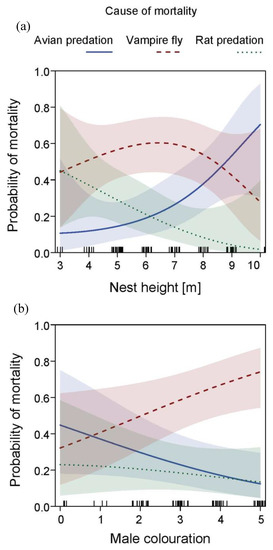 The random utility models (Table 2) exploring the three main causes of nesting failure (avian and rat predation, and avian vampire fly-related mortality) revealed a significant correlation with nesting height (quadratic term, LR χ2 = 13.37, p = 0.010; Figure 5a) and a non-significant trend with male age (LR χ2 = 5.65, p = 0.059; Figure 5b). Higher nests had a higher probability of being depredated by birds and lower nests had a higher probability of being depredated by rats. For this model (n = 77), the nesting height variable was missing for 10 nest records, and we removed one outlier of an exceptionally high nest (12 m); the statistical patterns remained unchanged but the removal improved model fit. Nests located at an average height (6 m) had a higher probability of being parasitized by vampire flies. Furthermore, avian vampire fly-related mortality showed a significant increase with increasing male age (partial coefficient, estimate 0.42 ± 0.19 SE, z-value = 2.20, p = 0.028), while no patterns between age and different forms of predation were apparent. Year and rainfall did not feature into the most parsimonious model.