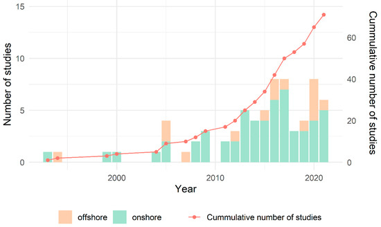 We found a total of 71 studies focusing on the effects of wind turbines on bird space use or abundance. The first studies go back to the 1990s, and this research topic became consistently more frequent after 2010. The majority of studies focused on onshore wind farms (n = 56; 79%) when compared with offshore power plants (n = 15; 21%) (Figure 1), probably reflecting the large proportion of the onshore industry [22]. The study area characteristics could be quite variable, as some studies focus on single wind farms, whilst others focus on multiple ones (maximum of 27), ranging from 1 to over 9000 wind turbines studied.