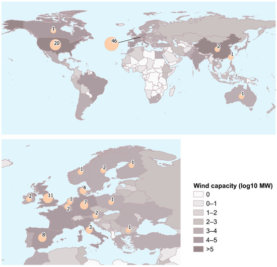 Wind energy installed capacity (log10 MW) [22] and distribution of original studies on bird displacement by wind turbines reviewed in this study (n = 71) at global (top) and European (bottom) scales.