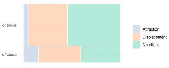 Overall, negative effects (i.e., displacement) were recorded in 40.6% of the trials, with offshore wind farms presenting a slightly higher frequency of displacement (43.8%) when compared to onshore wind farms (39.3%) (Figure 4). Still, attraction effects were recorded in 7.7% of the trials, being observed 15.0% at offshore wind farms, contrasting with only 4.9% at onshore environments (Figure 4). Such difference confirms previous findings that offshore wind farms may act as attractive locations for some species, by providing roosting locations and enhanced food resources as a result of an ‘artificial reef effect’ [3,8]. The lack of effects of wind turbines on birds’ abundance and space use was reported in 49% of the trials (Figure 4).